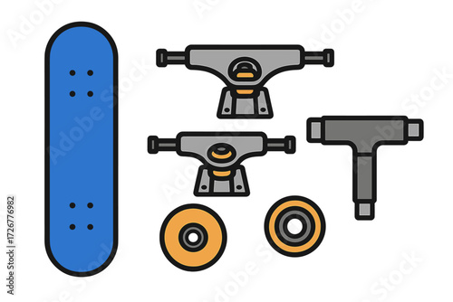© icon_art, Fototapeta premium Essential skateboard components set featuring deck, trucks, wheels, and T-tool for assembly and maintenance tasks