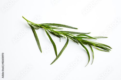 Fototapeta premium Estragon (Artemisia dracunculus); ein Zweig Estragon auf weißem Hintergrund