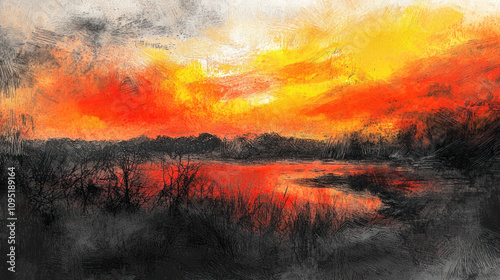 © Kiatisak78, Naklejka premium Ethereal Abstract Landscape in Fiery Red, Orange, and Yellow Tones Captured in High Resolution Charcoal Sketch Style for Artistic Inspiration