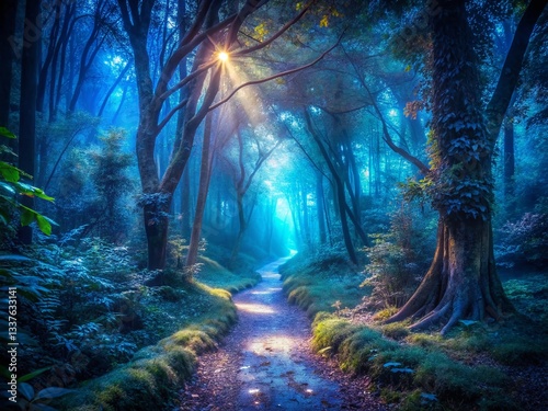 Obraz premium Ethereal Blue Light Illuminates Mysterious Dark Forest Path - Surreal Stock...