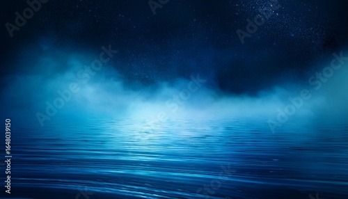 Fototapeta premium ethereal blue mist rising from a calm ocean surface at night creating a...
