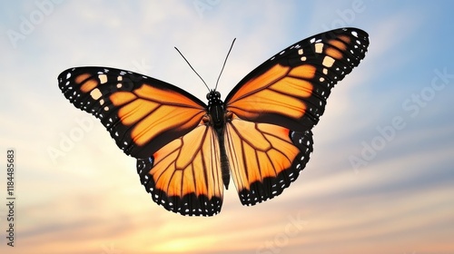 Fototapeta premium Ethereal Butterfly Flying Through a Radiant Sky at Dusk with Beautiful Orange and Black Wings