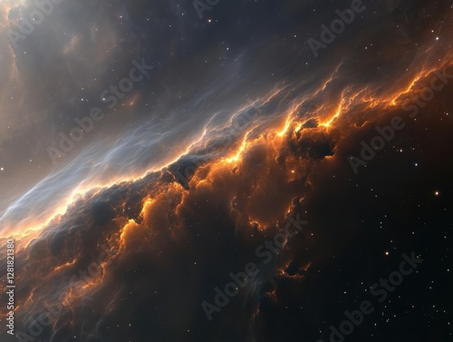 Fototapeta premium Ethereal celestial cloudscape with radiant orange glow and stardust against cosmic void backdrop for space exploration