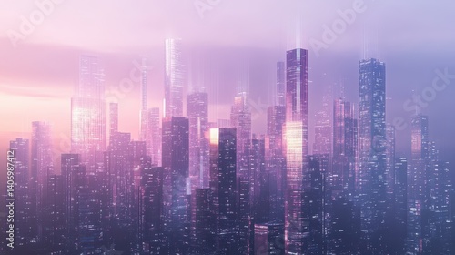 Fototapeta premium Ethereal Cityscape at Dusk with Glowing Skyscrapers in Pink Light