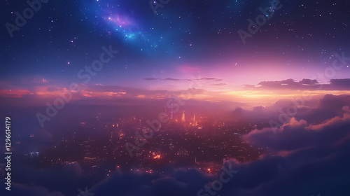 © Thiago, Fototapeta premium Ethereal cityscape under a cosmic sky at night. Glowing Nebula Cityscape. Illustration