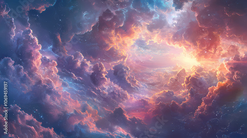 Fototapeta premium Ethereal cloudscape radiating heavenly light at sunset. Ethereal. Illustration