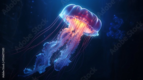 Naklejka premium Ethereal Comb Jelly Drifting in the Mysterious Ocean Depths Glowing...