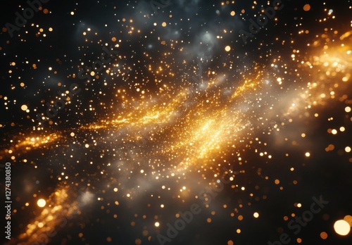 Fototapeta premium Ethereal Cosmic Scene with Glowing Golden Particles Amidst Dark Space...