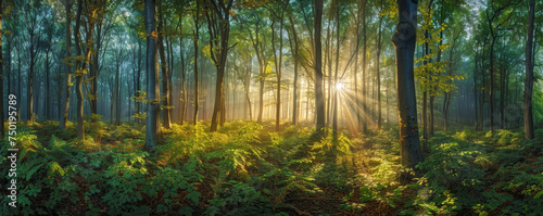 Fototapeta premium Ethereal Dawn Light Streaming Through a Lush Forest Canopy