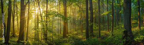 Fototapeta premium Ethereal Dawn Light Streaming Through a Lush Forest Canopy