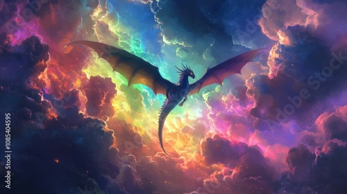 Obraz premium Ethereal dragon flying through a rainbow-filled sky, surrounded by mystical...