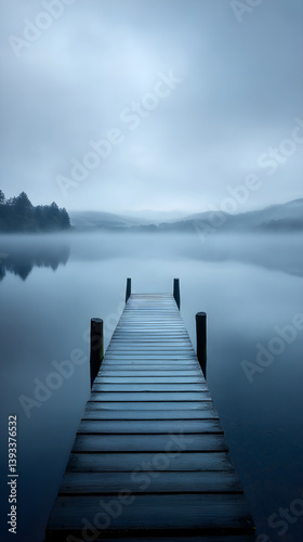 © Brett, Naklejka premium Ethereal Drift: Mist Over Lake Merging with Sky in a Tranquil Illusion