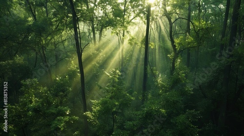 Fototapeta premium Ethereal early morning scene in a dense forest with sunlight filtering...