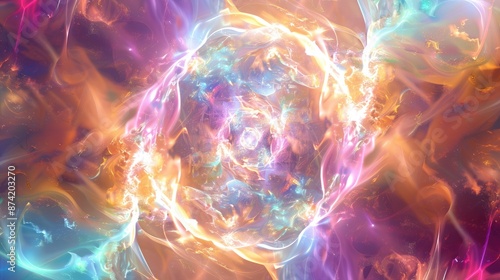 © The 2R Artificiality, Obraz premium Ethereal energy background with white light streams and a central vortex surrounded by aqua purple pink and golden yellow