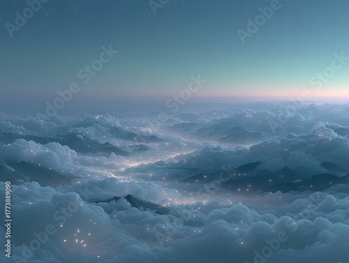 © nani, Fototapeta premium Ethereal fantasy landscape with glowing clouds and distant city lights at twilight with a starry sky above