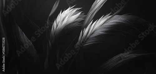 © Supardi, Fototapeta premium Ethereal feather arrangement on a dark background, artistic monochrome