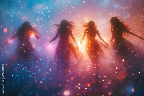 Obraz premium ethereal figures emerging from champagne bubbles dancing amidst shimmering light trails in a dreamlike party atmosphere
