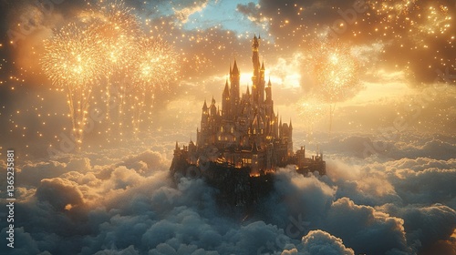 Obraz premium Ethereal Floating Castle Surrounded by Clouds with Beautiful Fireworks...