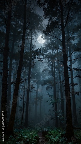 © claudunia, Fototapeta premium Ethereal, foggy twilight forest with moonlight.