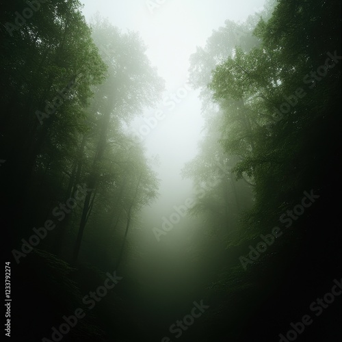 Naklejka premium Ethereal foggy woods scene enchanted forest nature soft diffused light low angle view mystical atmosphere