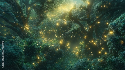 Naklejka premium Ethereal Forest Canopy Bathed in Glowing Lights: A Mystical Natural Ambiance