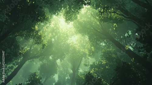 © ProStockGallery, Fototapeta premium Ethereal Forest Canopy Sunlight Streaming Through Lush Green Trees