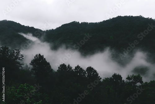 Fototapeta premium Ethereal forest landscape shrouded in mist