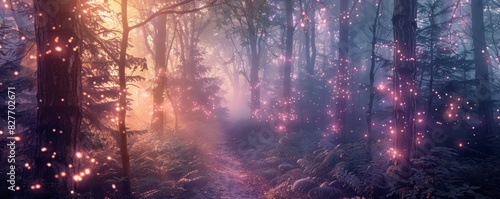 © Rattanathip, Naklejka premium Ethereal forest scene with glowing lights at sunset, creating a magical ambiance. Dreamy woodland landscape perfect for fantasy and nature themes.