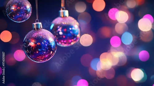 © Bijac, Fototapeta premium ethereal glass christmas ornaments floating against deep purple backdrop iridescent surfaces refracting neon pink and blue bokeh lights creating magical holiday atmosphere