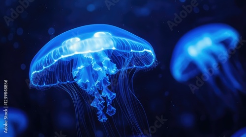 Fototapeta premium Ethereal Glowing Jellyfish Swimming Gracefully in Deep Blue Ocean Waters,...