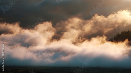 Naklejka premium Ethereal golden mist swirls across a serene rural landscape at dawn illuminated by soft sunlight breaking through dramatic clouds