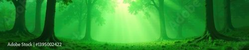 © Kai, Obraz premium Ethereal green mist ascends from a serene forest clearing, forest, green smoke
