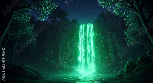 Obraz premium Ethereal Green Waterfall Cascading Through Dark Forest at Night, Fantasy Scene.