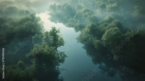 Fototapeta premium Ethereal Impressions of a Misty Woodland River Captured Through Aerial...