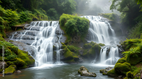 © hwsky, Fototapeta premium Ethereal Japanese Waterfall in Summer Mist