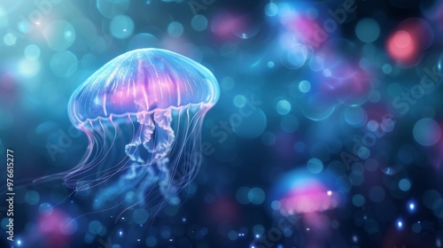 Fototapeta premium Ethereal Jellyfish Floating in Bioluminescent Waters, delicate tendrils...
