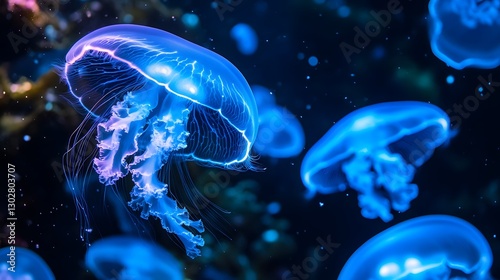© Kanika Graphic, Naklejka premium Ethereal Jellyfish Floating in Deep Blue Ocean Waters at Night