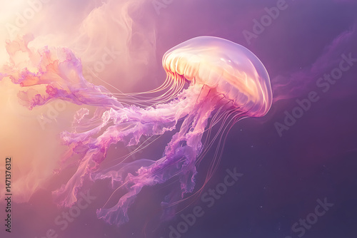 © Mariani, Fototapeta premium Ethereal jellyfish gracefully swims through a vibrant underwater scene, surrounded by colorful light