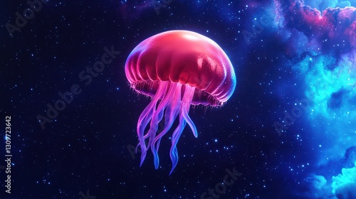 © Sweettymojidesign, Obraz premium Ethereal Jellyfish Shaped Like a Spaceship Floating in Cosmic Nebula