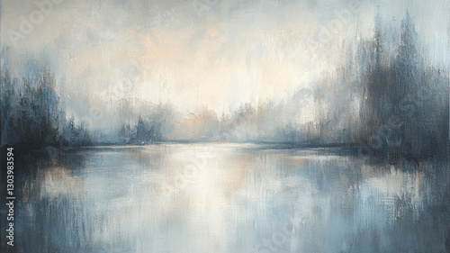 Fototapeta premium Ethereal landscape painting with misty water and soft colors, creating serene...