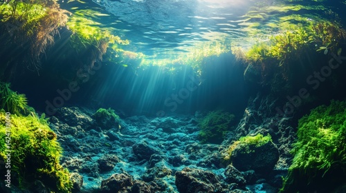© sukarman, Obraz premium ethereal landscape split between above and below a crystal clear stream