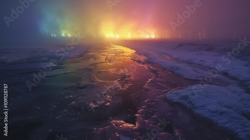Fototapeta premium Ethereal landscape with colorful lights and icy terrain.