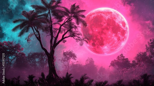 © Pojjanee, Fototapeta premium Ethereal Landscape with Vibrant Pink Moon and Lush Tropical Palm Trees at Night