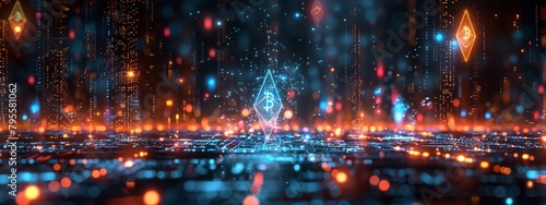 © Exnoi, Fototapeta premium Ethereal landscapes with floating, glowing holograms of various cryptocurrencies.