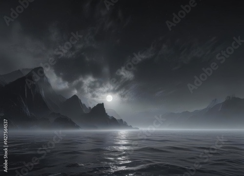 Naklejka premium Ethereal mist rises from inky black ocean, soft focus , abstract, black...