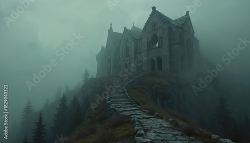 Naklejka premium Ethereal mist shrouds old mountaintop castle ruins. Stone stairs lead to...