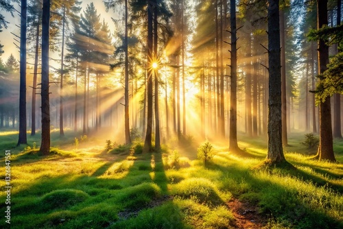 © Four888, Obraz premium Ethereal Misty Forest Sunlight Rays, Serene Nature, Tranquil Scene Stock Photo