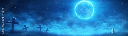 © Ndoomyim, Obraz premium Ethereal moonlight cemetery scene with a glowing orb in the night sky