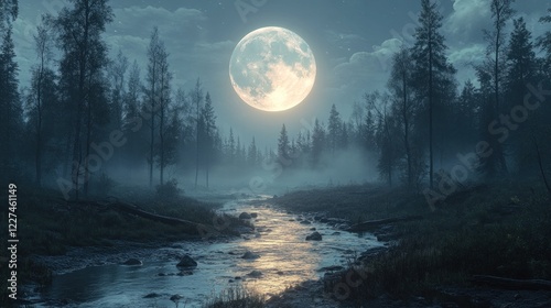© fufunafifu, Naklejka premium Ethereal Moonlit Forest with Mist and Reflections on Calm Water Under a Bright Full Moon