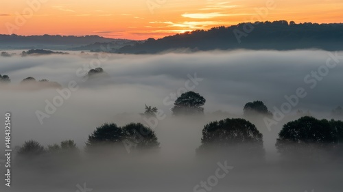 © Aimag, Fototapeta premium Ethereal Morning Mist Engulfing a Serene Valley Landscape at Golden Sunrise